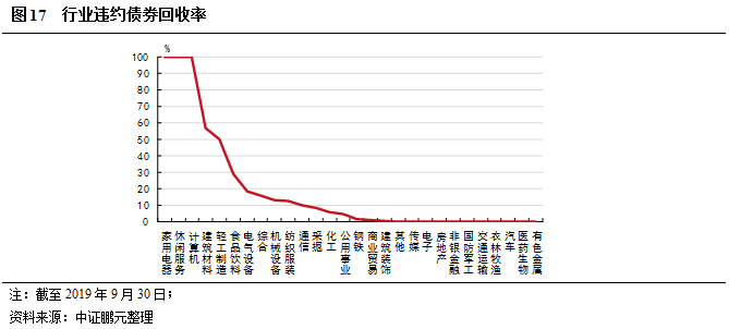 從行業(yè)來看,由于家用電器、休閑服務、計算機行業(yè)的違約債券較少,均已經全額兌付。其他違約債券較多行業(yè)中,輕工制造的回收率較高,在50%以上;食品飲料、綜合、機械設備、紡織服裝、公用事業(yè)、采掘的回收率一般,在8%~30%之間;化工、商業(yè)貿易、建筑裝飾的回收率較低,在1%~6%之間;房地產、交通運輸行業(yè)目前沒有回收的情況。