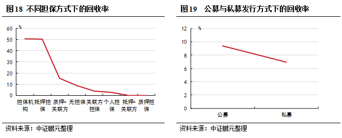 債券發(fā)行方式對回收率未有顯著的影響,公募發(fā)行債券違約回收率9.38%僅略高于私募發(fā)行方式的6.93%。