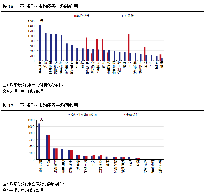 從部分兌付和未兌付違約債券的違約期看,部分兌付的債券中,化工行業(yè)的平均違約期最長,約2.94年,公用事業(yè)、食品飲料、通信時間較短,均在1年之內;無兌付的債券中,電氣設備、鋼鐵、國防軍工行業(yè)的平均違約期均在3年以上,通信行業(yè)平均違約期最短,在半年以內。