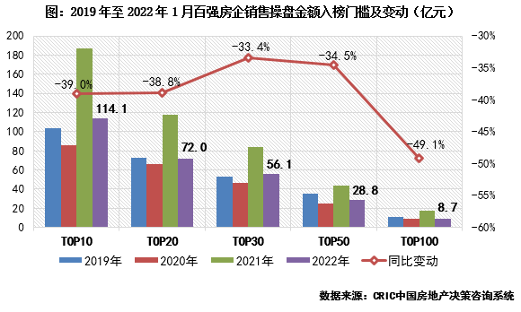 2022年1月,百強(qiáng)房企各梯隊銷售門檻較去年同期顯著降低。其中,TOP10和TOP20房企銷售操盤金額門檻分別為114.1億元和72億元,同比降低39%和38.8%。TOP30和TOP50房企的銷售操盤金額門檻也分別同比降低34%左右,門檻值僅略高于2020年同期。而TOP100房企的銷售操盤金額門檻同比降幅最高達(dá)49.1%,8.7億元的門檻值也處在近年來的最低水平。