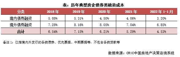融資成本:2022年1月100家典型房企新增債券類1融資成本4.53%,較2021年全年下降下降0.76pct,其中境外債券融資成本達(dá)6.85%,下降0.19pct,境內(nèi)債券融資成本3.20%,下降0.87 pct。環(huán)比2021年12月來看,總?cè)谫Y成本環(huán)比上升0.01pct,境外融資成本環(huán)比下降0.16pct,境內(nèi)融資成本環(huán)比下降0.53pct。境內(nèi)發(fā)債的企業(yè)中,可以進(jìn)行發(fā)債的企業(yè)成本相對較低,融資利率在2.50%-4.00%間,白名單企業(yè)繼續(xù)發(fā)揮融資優(yōu)勢,繼續(xù)發(fā)行利率較低的債券;境外發(fā)債成本方面,旭輝、遠(yuǎn)洋等發(fā)行了綠色擔(dān)保票據(jù),其成本不超過5%,也相對較低,還有部分企業(yè)完成了境外債的交換要約和額外發(fā)行,成本相對較高。