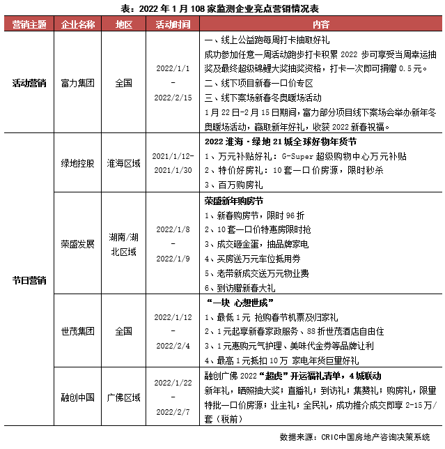 新年伊始,房企營銷積極性并不高,主要依托元旦和春節(jié)展開節(jié)日營銷活動。從市場來看,1月市場堪稱冷淡,29個重點監(jiān)測城市商品住宅供應(yīng)面積同、環(huán)比分別下降43%和58%,成交面積環(huán)比下降37%,同比跌幅擴(kuò)至46%。從營銷來看,本月房企營銷積極性不高,少有房企推出集團(tuán)性活動,區(qū)域聯(lián)動營銷也比較少,僅有世茂、綠地、融創(chuàng)、榮盛等房企推出了一些節(jié)日活動,自碧桂園21年底推出步數(shù)打卡,富力本月借助東奧契機(jī)亦推出“線上公益跑”打卡活動。