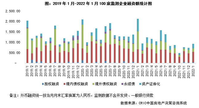 融資總量:2022年1月100家典型房企的融資總量為929.46億元,環(huán)比上升26%,同比下降56%。自2019年以來,每年年初房企融資量都相對較大,均超過2000億元,而本月融資量不足千億元,一方面在當(dāng)前房企危機(jī)仍未全面解除的情況下,金融機(jī)構(gòu)當(dāng)前白名單企業(yè)相對較少,放款較為謹(jǐn)慎;另一方面,部分企業(yè)為緩解年初的償債壓力已提前償還部分債券,同時減少新增融資計劃,導(dǎo)致融資量同比下滑較大。從融資結(jié)構(gòu)來看,境內(nèi)債權(quán)融資499.08億元,環(huán)比上升9.8%,同比下降24.6%;境外債權(quán)融資169.66億元,環(huán)比上升10.0%,同比下降80.1%;本月資產(chǎn)證券化有所回升,融資223.01億元,環(huán)比上升97.9%,同比下降63.0%。