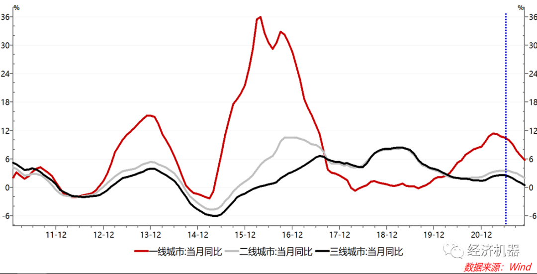 房地產方面,房地產銷售面積當月同比增速從6月底的7.5%,大幅下降至11月份的-14%,房地產行業幾乎“一夜入冬”。房地產下滑有周期性原因,2015-2020年,房地產行業呈現復蘇和分化走勢,行業自身存在調整性需求。2021年下半年以來,供需兩端多種因素疊加下,房地產行業出現了同步的下行(圖1)。