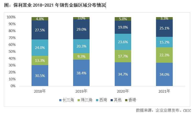在城市能級方面,保利置業近兩年加大在三四線城市的布局,占比自2019年以來連年攀升,2021年占比達到30.9%,同比增長9.4個百分點,同時也加大在一線城市的布局,2021年一線城市的占比達到33.6%,同比上升18.1個百分點。而在區域布局方面,保利置業于長三角和珠三角區域拿地的建面占比最高,分別達到40%和37%,占比分別同比增長了9個百分點和18個百分點。