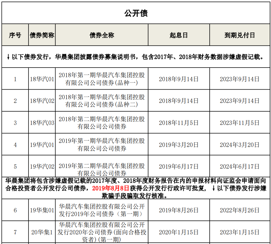 根據(jù)我們的不完全統(tǒng)計(jì), 目前華晨集團(tuán)仍存續(xù)13只債券未完全兌付, 從債券發(fā)行和存續(xù)時(shí)間上來看, 發(fā)行于2018年4月28日(2017年年報(bào)的發(fā)布之日)之后的債券均在募集說明書中直接引用和摘取了2017年、2018年(如有)年度報(bào)告中的財(cái)務(wù)數(shù)據(jù), 而發(fā)行于2018年4月28日之前的債券在其存續(xù)期間同樣引用了上述財(cái)務(wù)數(shù)據(jù)并進(jìn)行了信息披露。因此, 如下述列舉的債券沒有遺漏, 我們其實(shí)可以較為大膽地說, 目前存續(xù)的華晨集團(tuán)債券均存在虛假信息陳述的問題, 債券持有人可以基于華晨集團(tuán)的債券虛假陳述嘗試主張賠償責(zé)任。