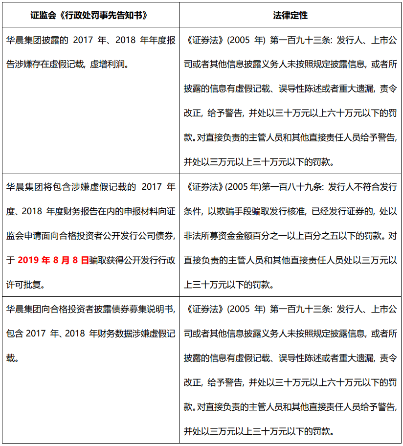 2021年4月20日, 中國證監(jiān)會(huì)因華晨集團(tuán)涉嫌信息披露違法違規(guī)對其進(jìn)行立案調(diào)查一事已有定論: 相較于上交所和遼寧證監(jiān)局出具的監(jiān)管函認(rèn)定的“債券存續(xù)期間未及時(shí)履行信息披露義務(wù)”, 證監(jiān)會(huì)在《行政處罰事先告知書》(處罰字[2021]24號)中重拳出擊, 新增認(rèn)定華晨集團(tuán)涉嫌“四宗”證券虛假陳述行為, 擬對華晨集團(tuán)處以5360萬元罰款。