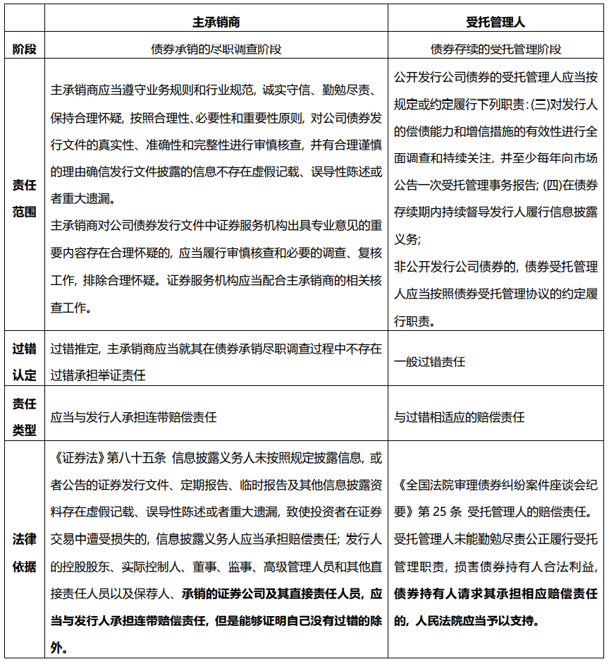 所謂能力越大, 責(zé)任越重, 中介機(jī)構(gòu)在債券發(fā)行和存續(xù)中的身份和職責(zé)不同, 其過錯(cuò)認(rèn)定和責(zé)任承擔(dān)的方式也隨之不同。而其中最易混淆的是就是券商在債券承銷和存續(xù)階段的雙重身份: