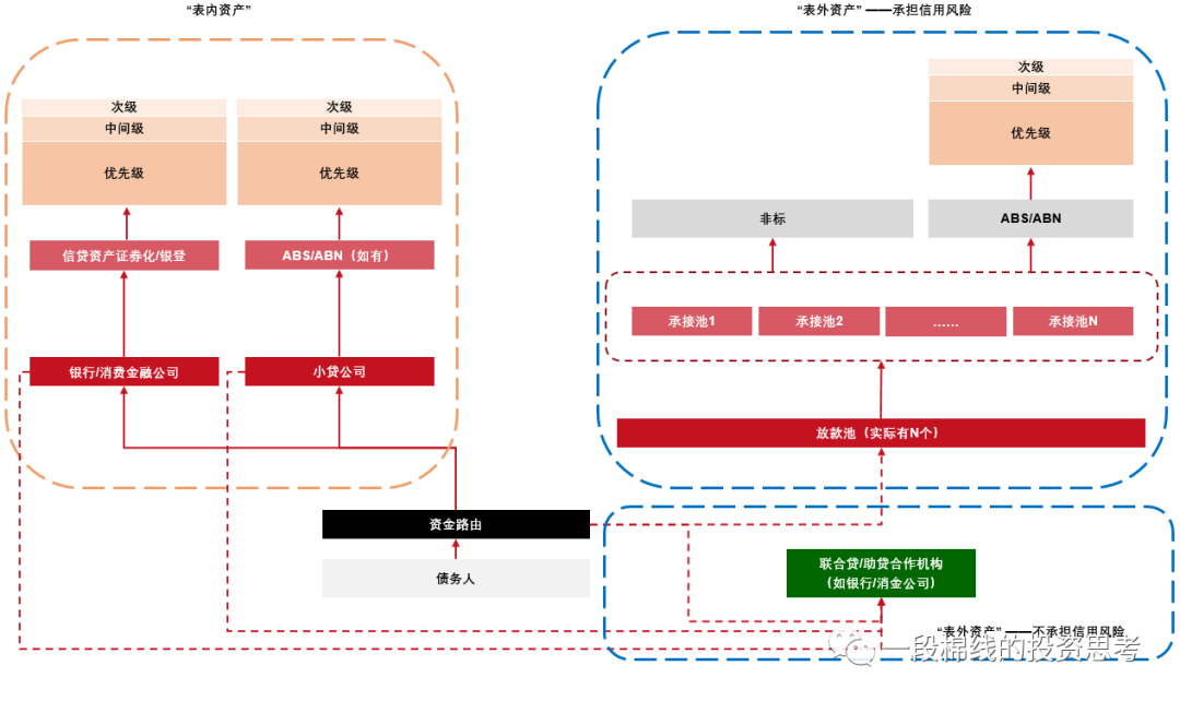 通過體系內作為非金融企業的小貸公司,或作為金融機構的銀行/消費金融公司發放全部或部分(針對聯合貸)貸款。在不同主體下的貸款可以通過叫做”交易所企業資產證券化“、”信貸資產證券化“或”銀登結構化“等不同名字的證券化產品進行再融資。