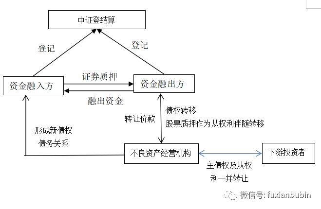 場外質(zhì)押系指債務(wù)人或第三人以其持有的股票進(jìn)行質(zhì)押擔(dān)保,為其向債權(quán)人的借款進(jìn)行擔(dān)保的交易行為。場外質(zhì)押并沒有標(biāo)準(zhǔn)化的業(yè)務(wù)模式,實(shí)踐過程中開展此類型業(yè)務(wù)的模式多種多樣。在不良資產(chǎn)收購轉(zhuǎn)讓業(yè)務(wù)中,依然是不良資產(chǎn)經(jīng)營機(jī)構(gòu)在從資金融出方手中收購債權(quán)過程中,將質(zhì)押的股票作為從權(quán)利進(jìn)行轉(zhuǎn)移,在通過轉(zhuǎn)讓方式找到合適下游投資者的過程: