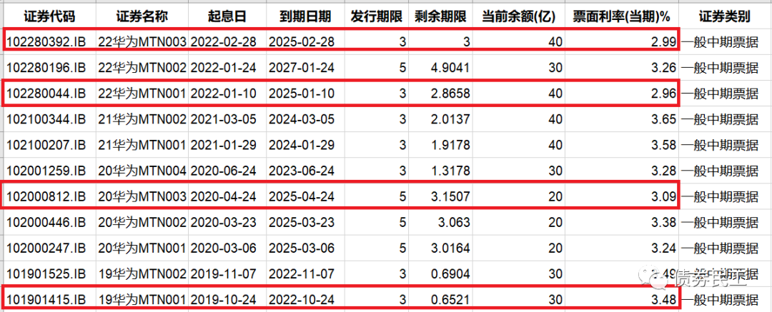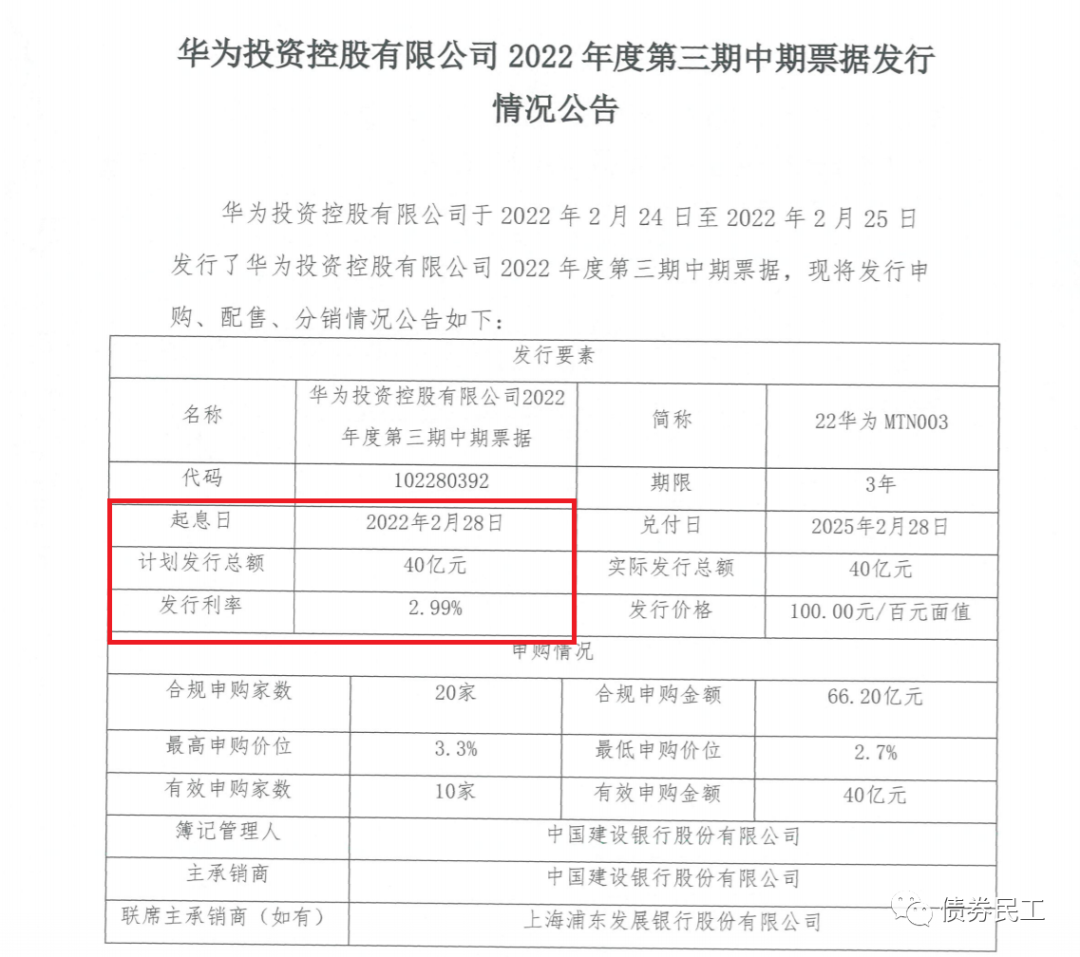 根據華為投資控股有限公司(以下簡稱“華為投資”)于2022年2月28日公告的發行情況公告,發行金額為40億元的“22華為MTN003”成功發行,發行利率為2.99%!本期中期票據的起息日是2022年2月28日,債券期限為3年。