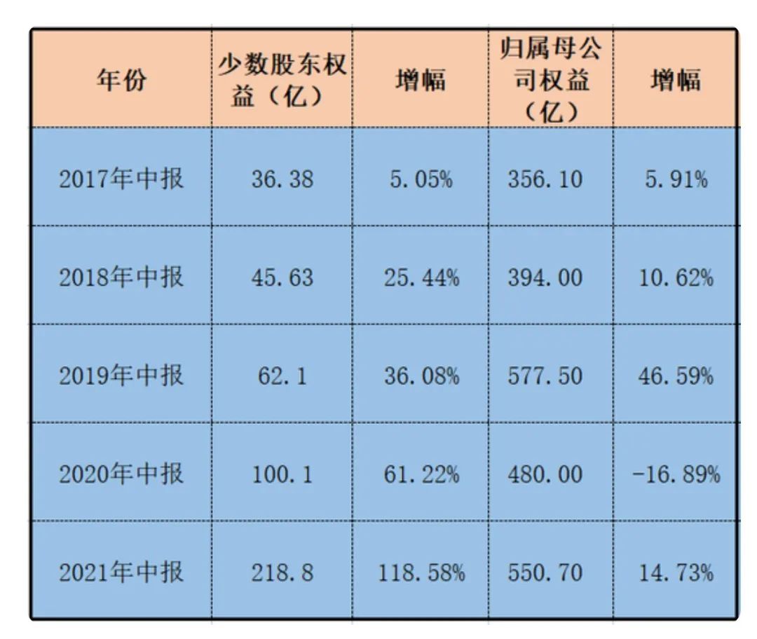 2017年到今年上半年,雅居樂的少數股東權益一路飆增,分別達到23.1億、54.1億、73.0億、125.2億、218.83億。