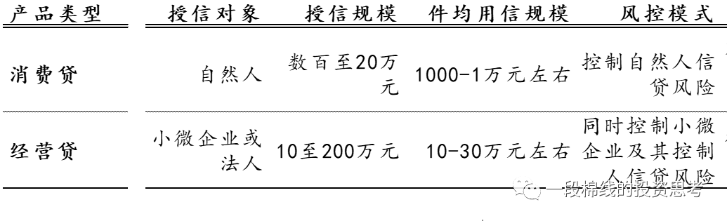 為一線貸款機(jī)構(gòu)的潛質(zhì);在經(jīng)營(yíng)貸領(lǐng)域,具備判斷客戶信用風(fēng)險(xiǎn)的獨(dú)特?cái)?shù)據(jù)來(lái)源,并穩(wěn)定占有100萬(wàn)名高復(fù)貸率小微客戶的機(jī)構(gòu)具備成為一線貸款機(jī)構(gòu)的潛質(zhì)。