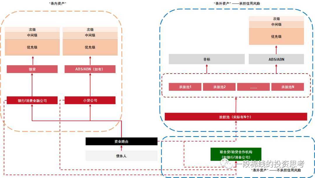 1)零售信貸行業(yè)完整的“資產(chǎn)負(fù)債表”應(yīng)該囊括所有實(shí)際承擔(dān)信用風(fēng)險(xiǎn)、賺取超額收益的資產(chǎn)及負(fù)債(應(yīng)并入實(shí)際抽走超額收益并隱含承擔(dān)還款義務(wù)的金融產(chǎn)品);
