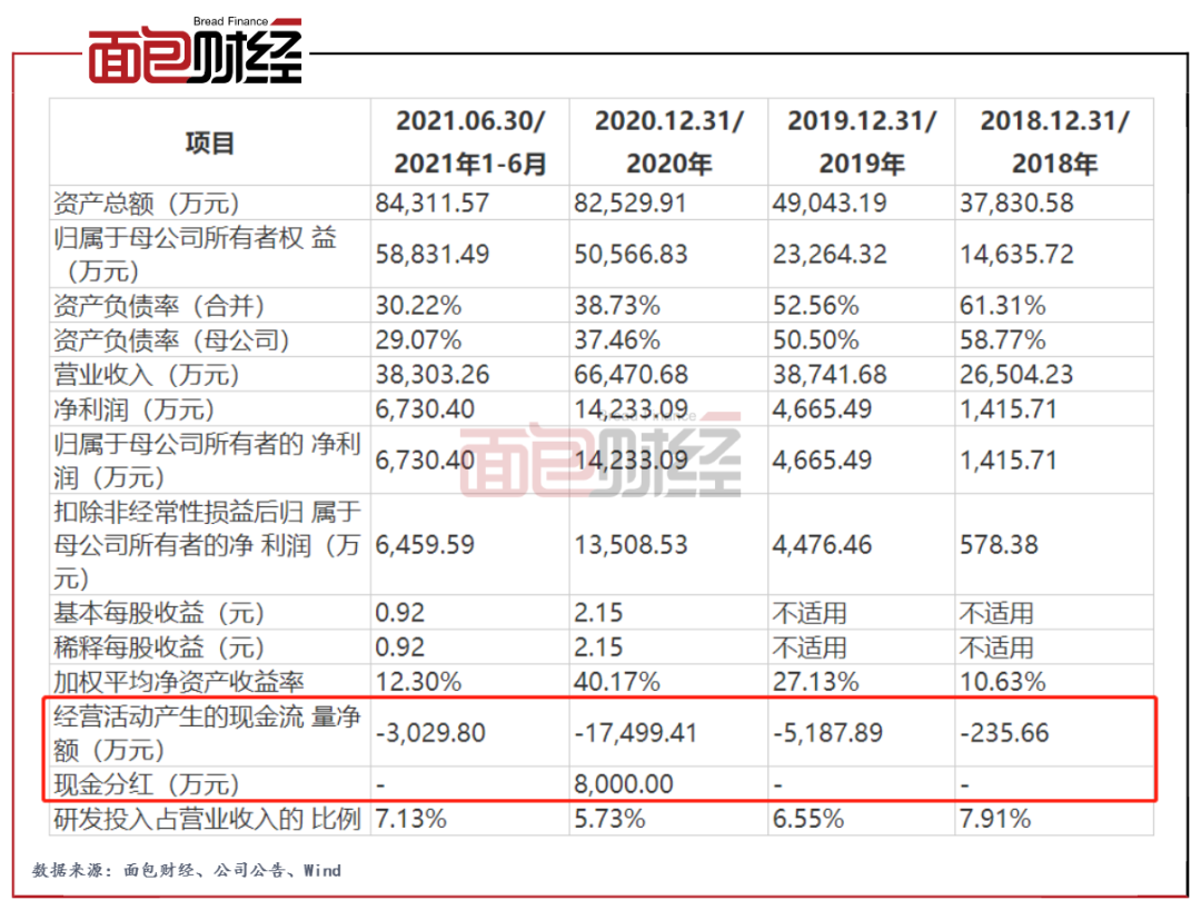 德科立近年來經(jīng)營活動產(chǎn)生的現(xiàn)金流量一直為凈流出狀態(tài)。2019年至2021年上半年,公司經(jīng)營活動產(chǎn)生的現(xiàn)金流量凈額分別為-0.52億元、-1.75億元、-0.3億元。
