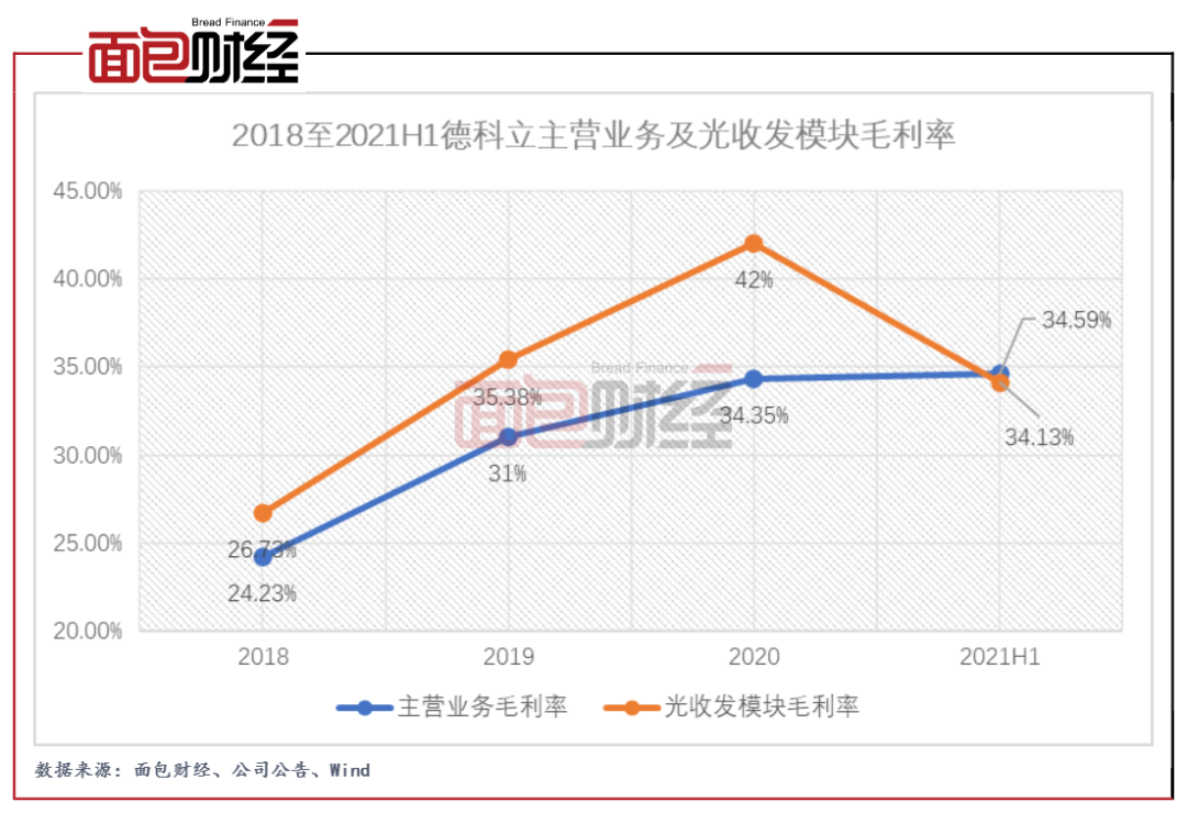 2018年至2020年,德科立主營業(yè)務(wù)毛利率分別為24.23%、31.00%、34.35%,呈現(xiàn)上升趨勢。