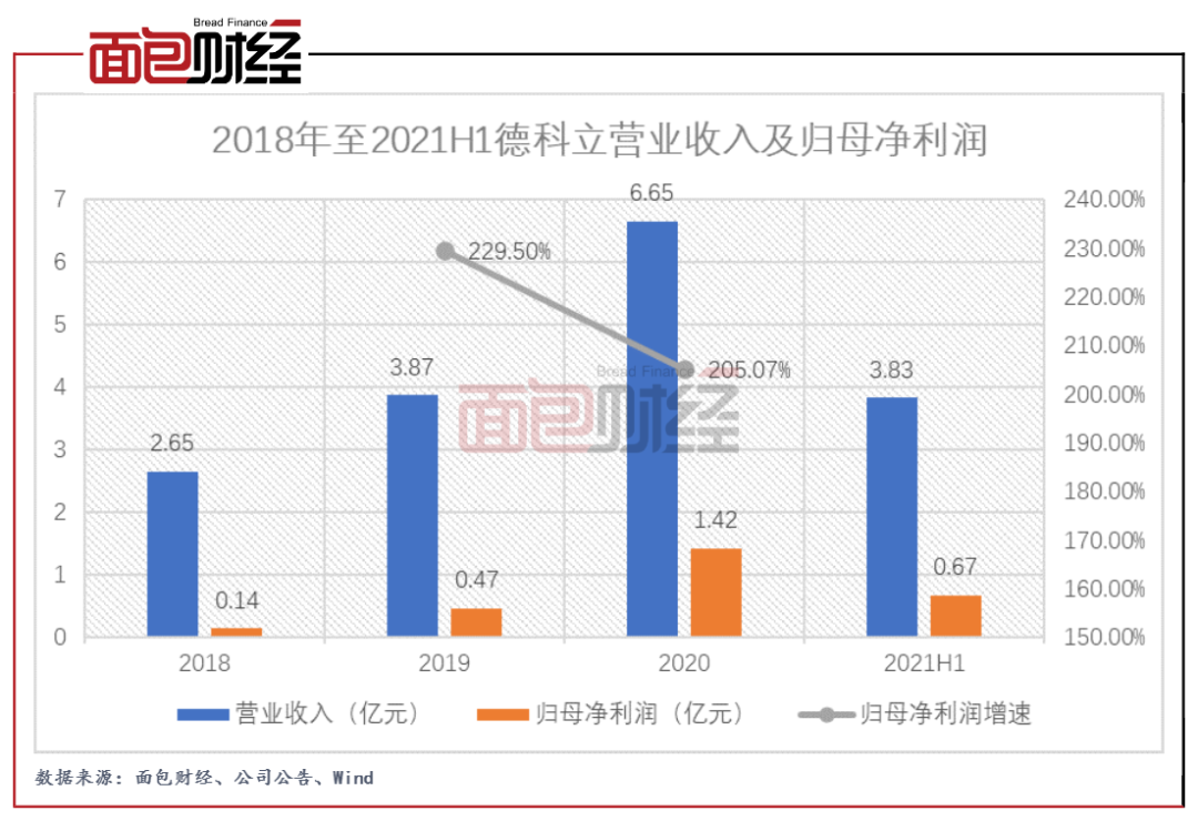 2019年和2020年德科立實現(xiàn)營業(yè)收入分別為3.87億元、6.65億元,同比分別增長46.17%、71.57%;實現(xiàn)歸母凈利潤分別為0.47億元、1.42億元,同比均增長2倍以上。2021上半年,公司實現(xiàn)營業(yè)收入3.83億元;實現(xiàn)歸母凈利潤6730.4萬元。