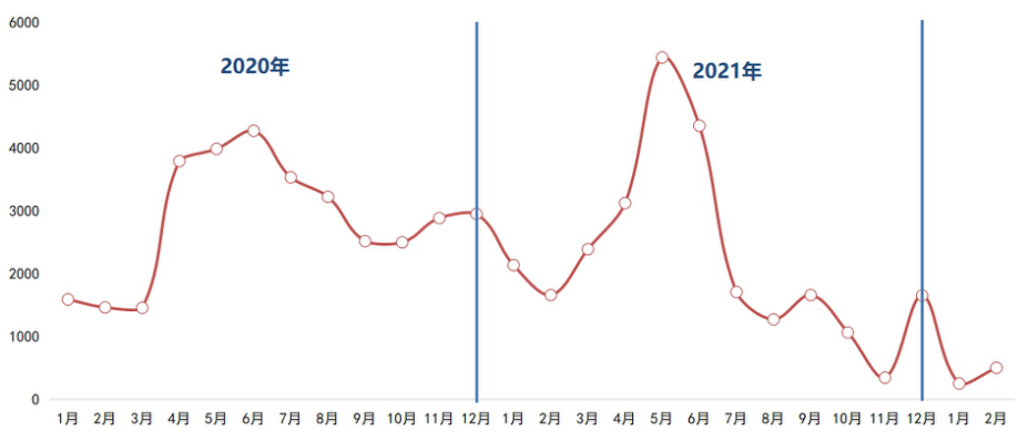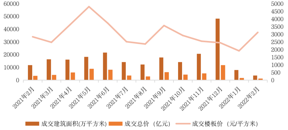 圖:2020年1月-2022年2月銷售TOP50房企單月拿地金額走勢(單位:億元)