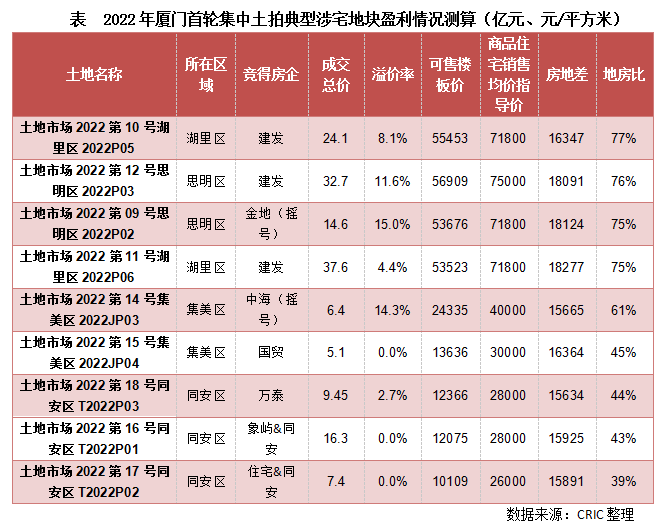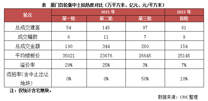 對(duì)比2021年第三輪集中土拍,廈門2022年首輪集中土拍熱度明顯上漲,整體溢價(jià)率高達(dá)7%,較去年第三輪明顯提升。