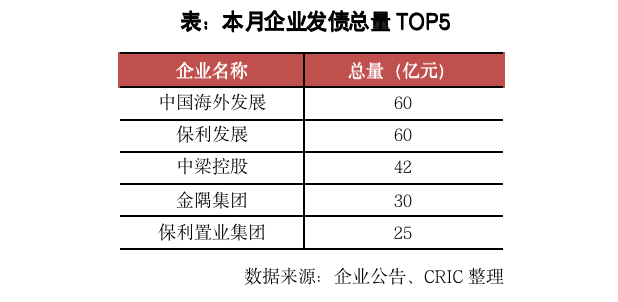 5月房企發(fā)債375.07億元,環(huán)比增加0.6%,同比減少35.2%。其中,境外發(fā)債約61.07元,環(huán)比增加366.9%,同比減少80.9%,主要是因?yàn)?月僅有遠(yuǎn)洋集團(tuán)發(fā)行了一筆2億美元的綠色票據(jù),而本月則有中梁和大唐因?yàn)榻粨Q要約而發(fā)行了3筆優(yōu)先票據(jù)。境內(nèi)發(fā)債314億元,環(huán)比減少12.7%,同比增加21.1%,其中,公司債發(fā)行145億元,環(huán)比減少20%,同比增加50.3%;中期票據(jù)發(fā)行93億元,環(huán)比增加2.7%,同比減少23.4%;融資券發(fā)行30億元,環(huán)比減少65.9%,同比減少25%,境內(nèi)發(fā)債主體仍然基本為央企國(guó)企。