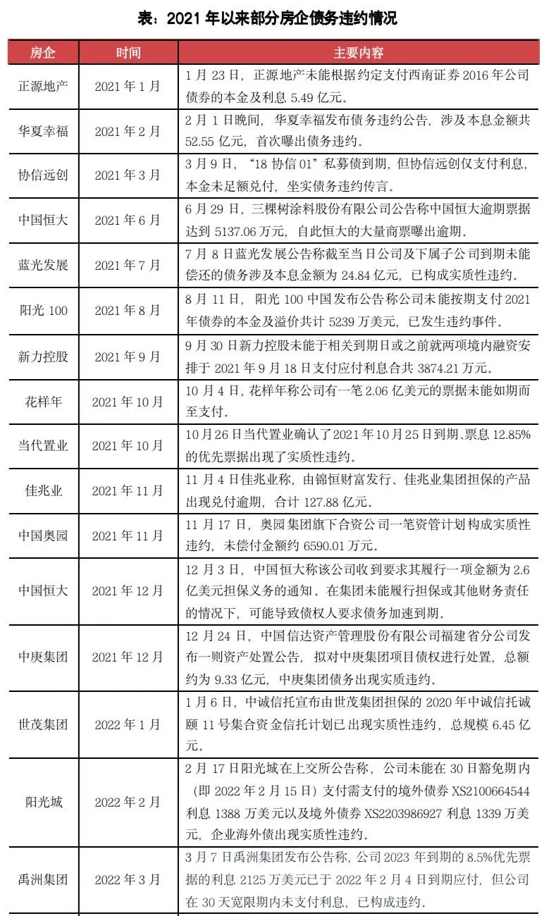 在債務(wù)違約方面,本月龍頭房企融創(chuàng)中國(guó)和北京房企鴻坤偉業(yè)分別發(fā)布公告稱未能按期支付旗下境外票據(jù)利息,構(gòu)成了實(shí)質(zhì)性違約,融創(chuàng)也是繼恒大之后又一家出現(xiàn)美元債違約的龍頭房企。整體來(lái)看,當(dāng)前還有不少房企存在流動(dòng)性問(wèn)題,因此未來(lái)仍有可能有更多房企曝出債務(wù)違約事件,仍需要行業(yè)注意。