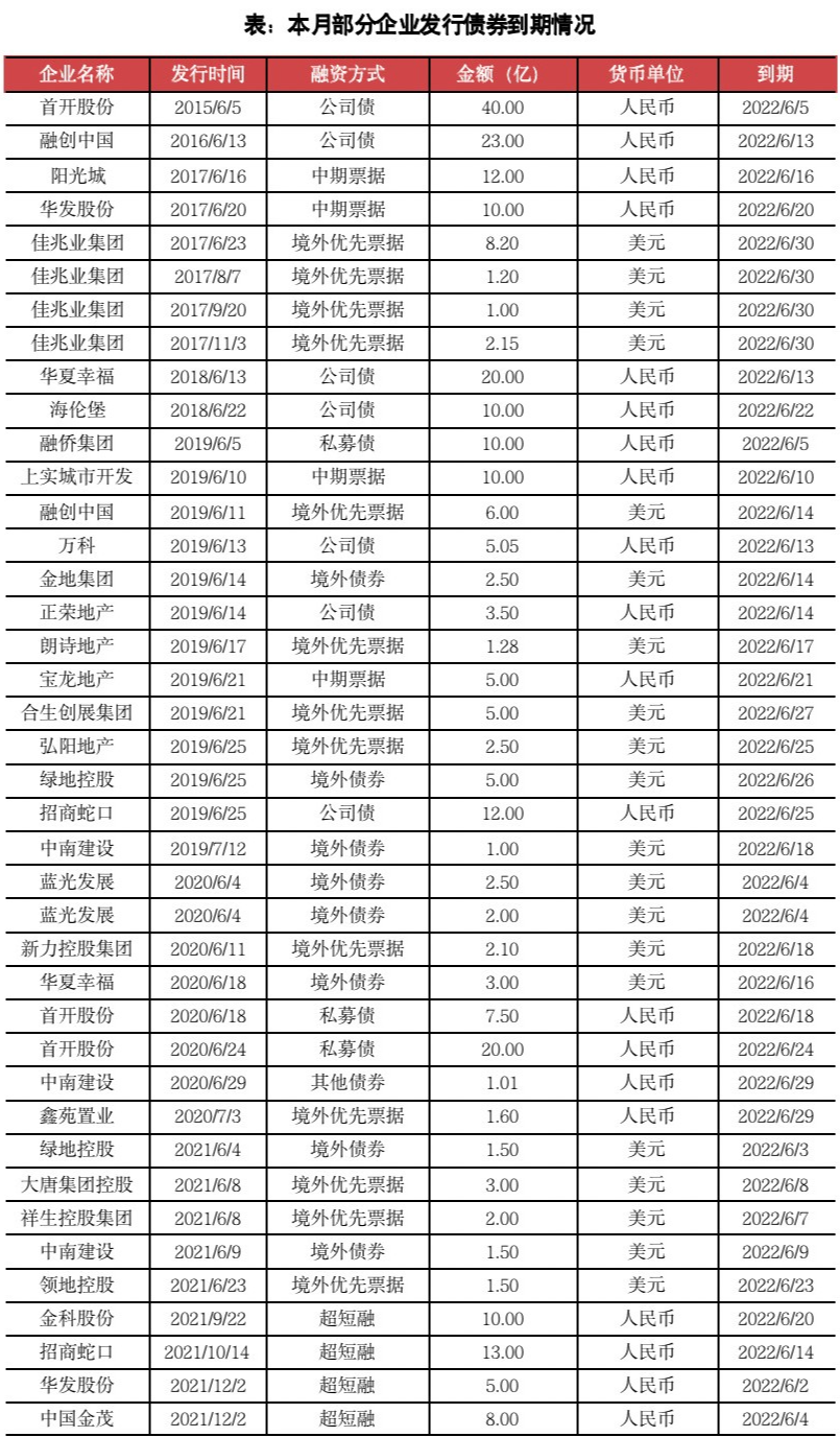 提前關(guān)注到2022年6月將有44筆債券到期,合計(jì)約639億元,環(huán)比增加68.6%,又一波償債潮即將到來(lái)。其中,佳兆業(yè)到期的4只境外優(yōu)先票據(jù)、新力到期的一只優(yōu)先票據(jù)以及華夏幸福的一筆境外債已經(jīng)出現(xiàn)了利息違約。從到期債券規(guī)模來(lái)看,單筆金額最高為佳兆業(yè)于2017年發(fā)行的8.2億美元的境外優(yōu)先票據(jù)。