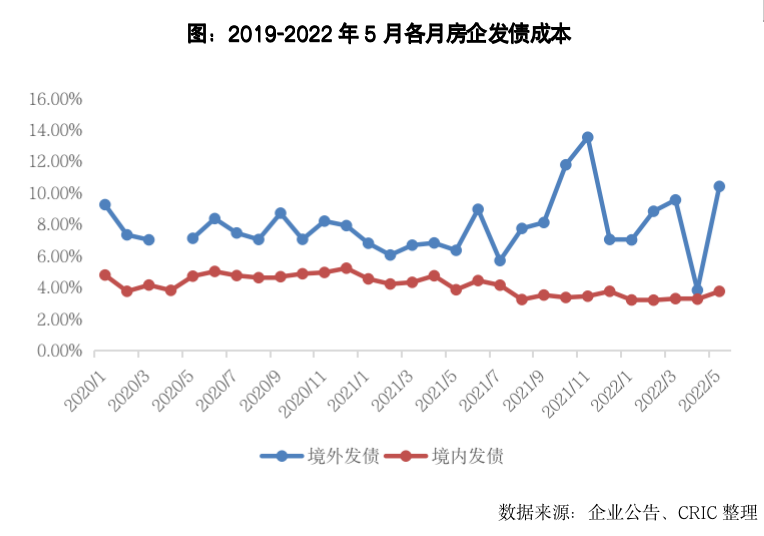 2022年5月100家典型房企新增債券類融資成本4.81%,環(huán)比上升1.55pct,同比下降0.4pct。其中境內(nèi)融資成本3.73%,環(huán)比上升0.5pct,發(fā)債主體仍是集中在中海、保利發(fā)展、華潤(rùn)置地等國(guó)企央企;境外融資成本為10.38%,環(huán)比大幅提升了6.58pct,主要是因?yàn)樯蟼€(gè)月僅有遠(yuǎn)洋集團(tuán)發(fā)行了一筆成本較低的綠色債券,而本月則有中梁和大唐因?yàn)榻粨Q要約發(fā)行了3筆優(yōu)先票據(jù),融資成本都相對(duì)較高。2022年截至5月100家典型房企新增債券類融資成本4.39%,較2021年全年下降0.89個(gè)百分點(diǎn),其中境外債券融資成本7.98%,較2021年全年上升0.96個(gè)百分點(diǎn),境內(nèi)債券融資成本3.35%,較2021年全年下降0.71個(gè)百分點(diǎn)。