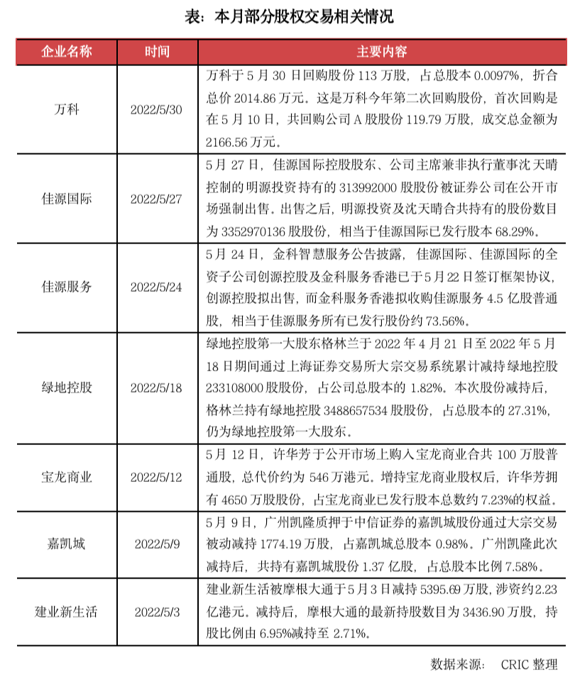 本月沒(méi)有房企或房企旗下公司完成上市或遞交招股書(shū),因此截至2022年5月底,在港交所提交過(guò)招股書(shū)但仍未上市的房企和房企旗下公司分別為13家和22家。整體看來(lái),2022年房企在上市和分拆上市方面難度加大,房企的熱情也有所冷卻。除此之外比較值得關(guān)注的是,金科服務(wù)在本月與佳源服務(wù)達(dá)成了協(xié)議,計(jì)劃收購(gòu)佳源服務(wù)73.56%的股權(quán),未來(lái)行業(yè)內(nèi)的并購(gòu)案仍可能繼續(xù)增加。