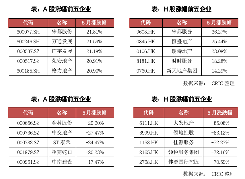 本月兩市的地產(chǎn)相關(guān)股表現(xiàn)都較為一般。A股地產(chǎn)股整月上漲的股票占比為56%,而H股整月上漲的股票占比則僅為26%。在H股方面,本月宋都服務(wù)的月漲幅達(dá)到了36.27%,是H股漲幅最大的地產(chǎn)相關(guān)股。企業(yè)從5月4日開(kāi)始連續(xù)大漲,在11日甚至達(dá)到了近20%的漲幅,奠定了整月漲幅的基礎(chǔ),此后雖然股價(jià)略有波動(dòng),但是整月最終的漲幅仍然達(dá)到了36.27%。