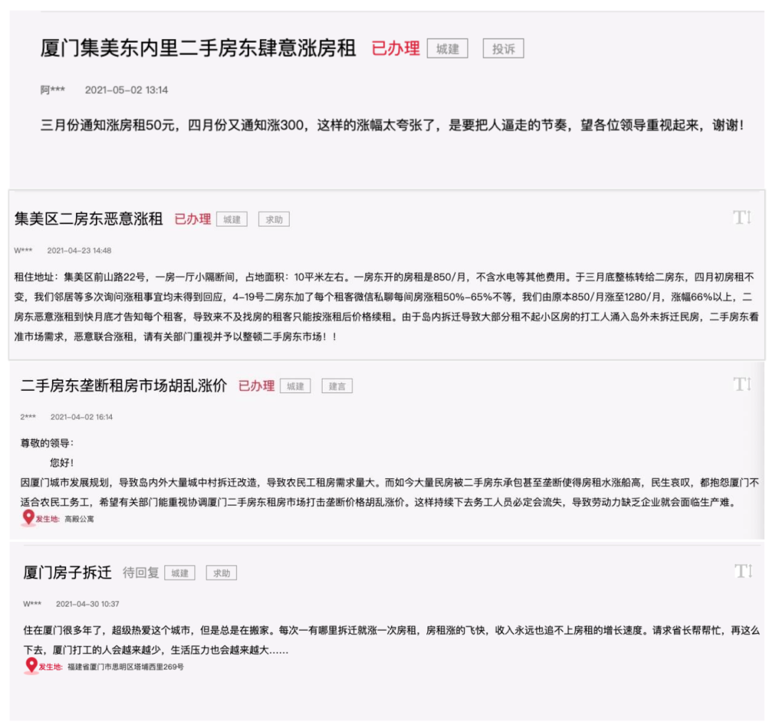 所以,沒有被拆遷波及的城中村以及小區(qū)的房源變得緊俏,租客們時(shí)不時(shí)就會(huì)收到房東發(fā)來的漲租問候。在人民網(wǎng)的「領(lǐng)導(dǎo)留言板上」,有不少廈門租客反映被無序漲租。